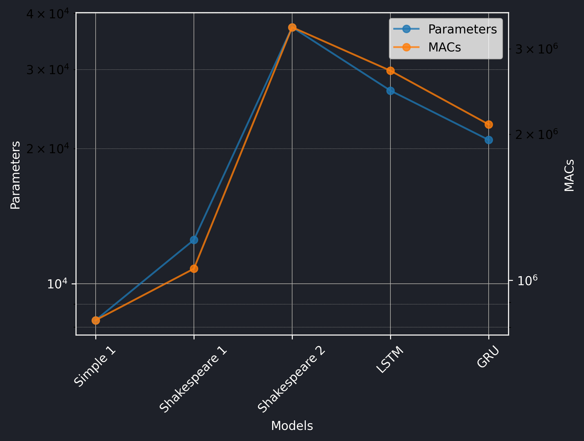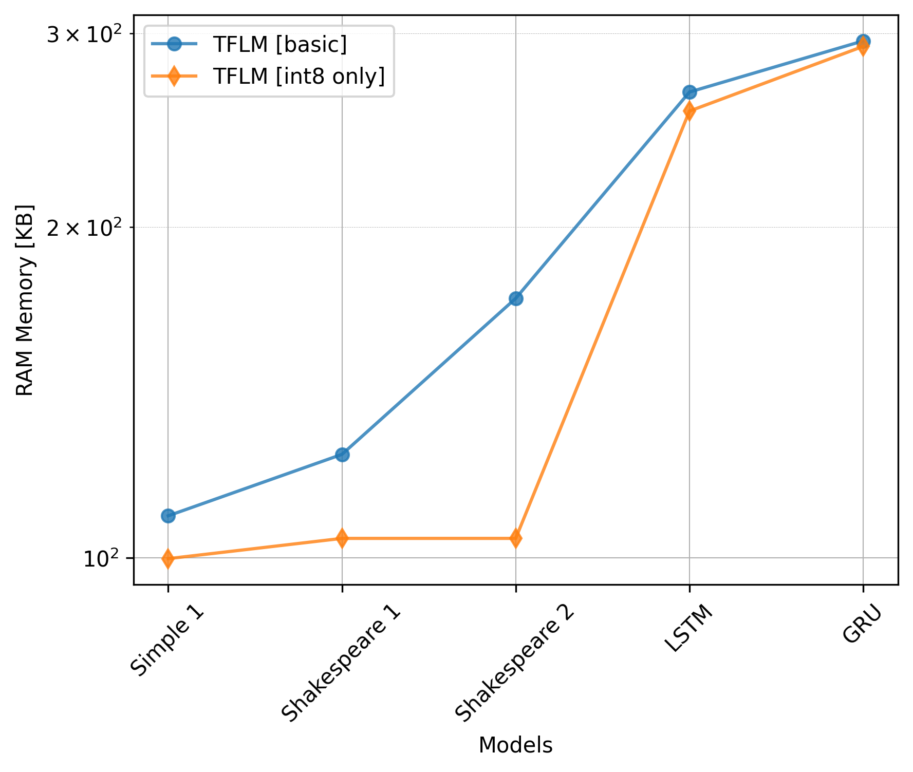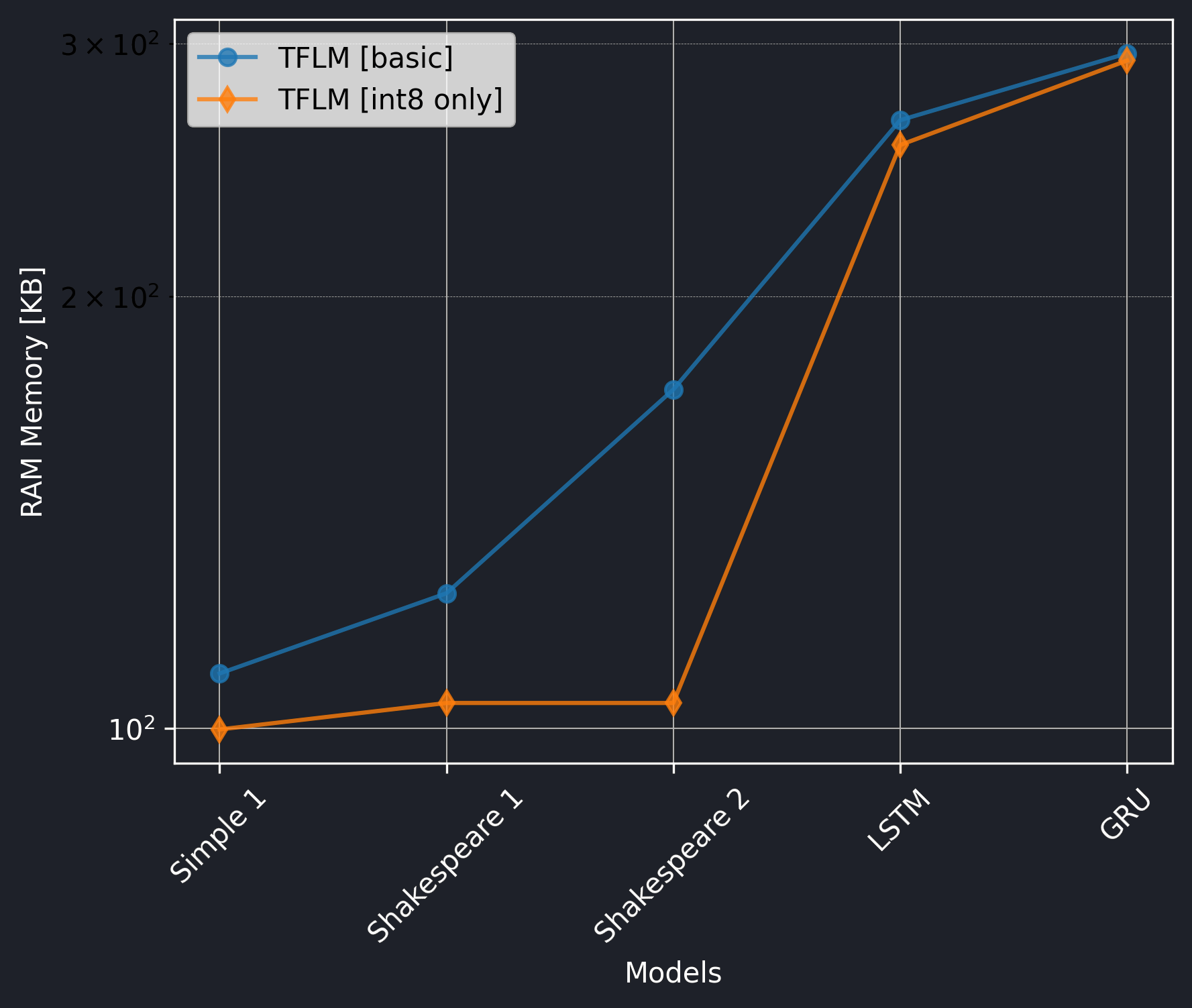 It's believed that LSTM is more powerful than GRU, but GRU is more parameter and computation efficient. Also, in our study, we see that LSTM has more parameters and MACs than GRU. However, it is interesting that using TFLM, GRU has a larger flash size and RAM usage than LSTM. Still, it's executed faster than LSTM.