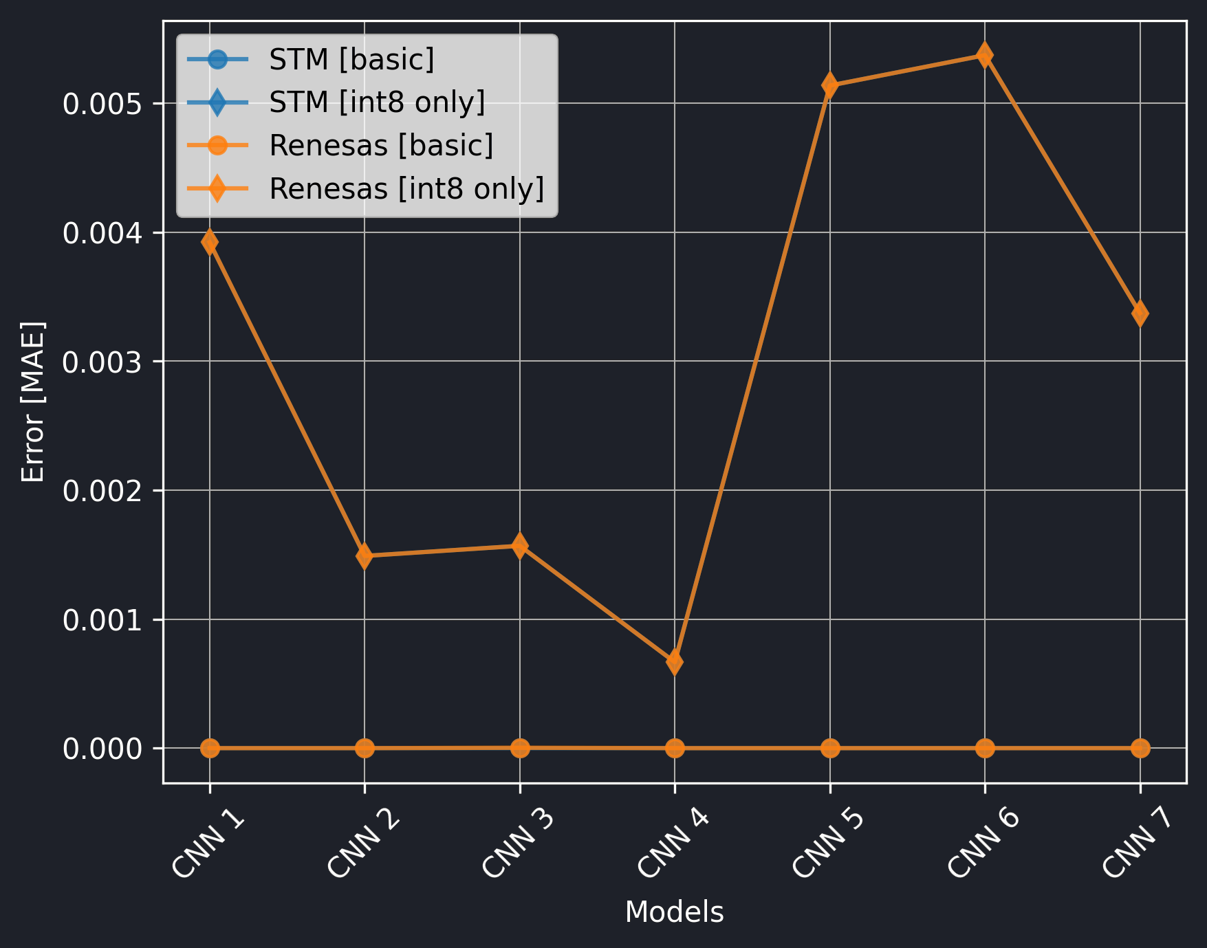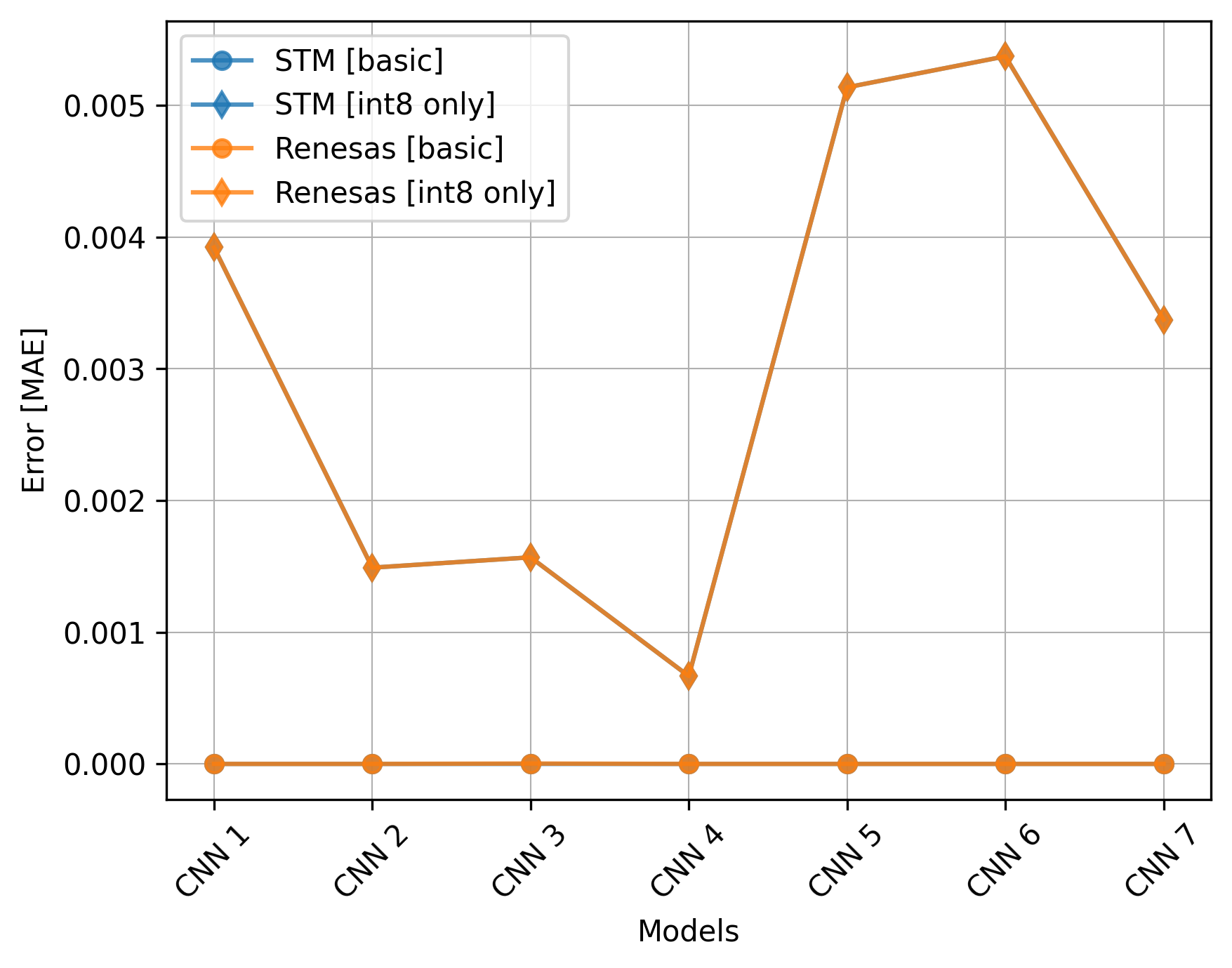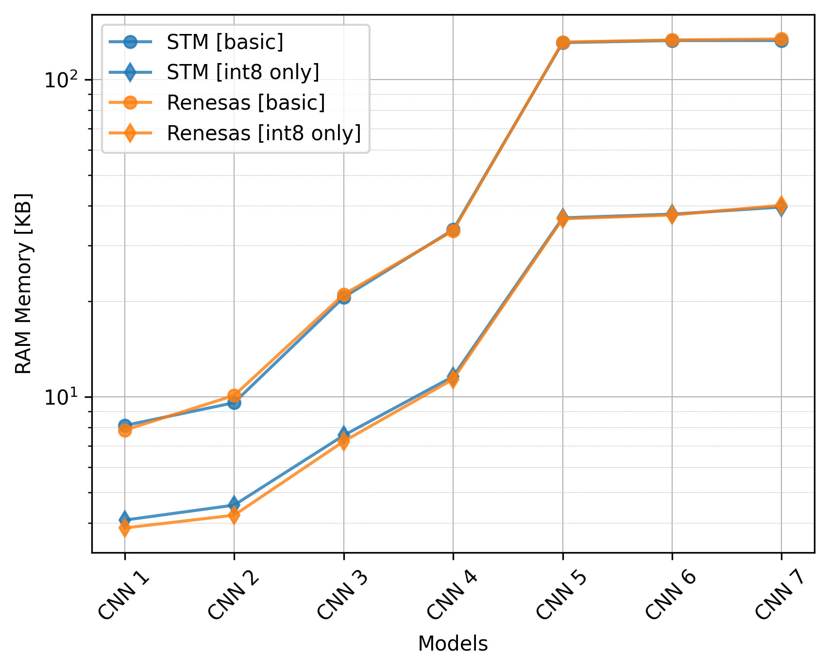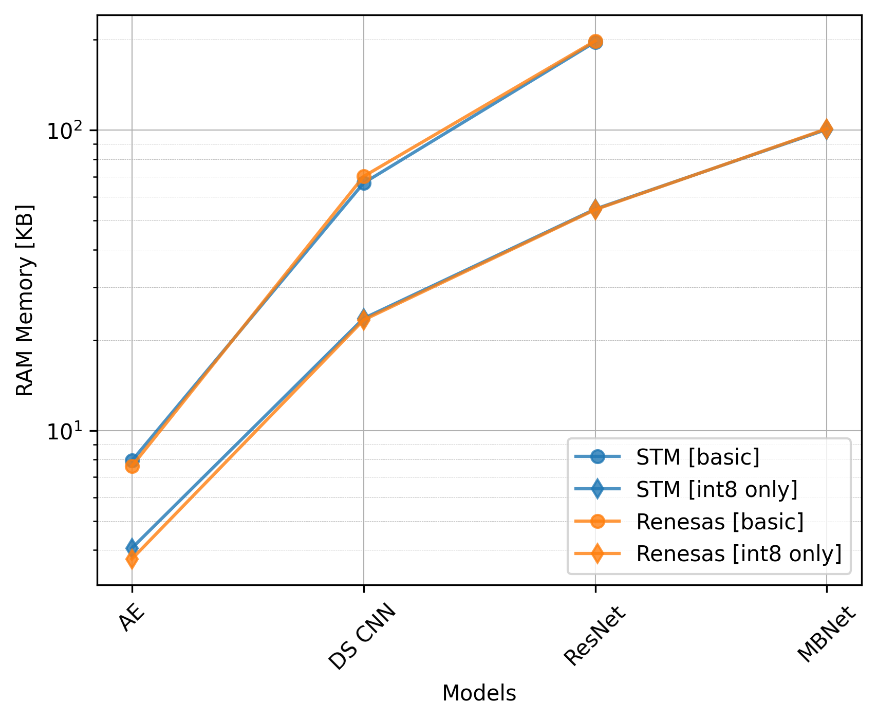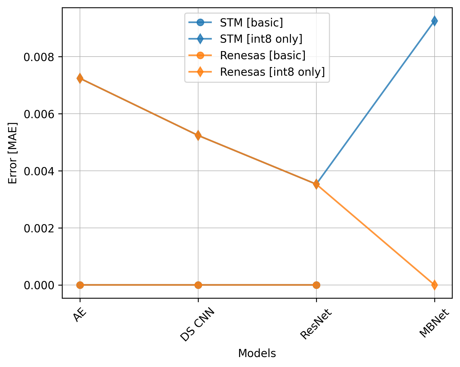The Renesas board did not utilize the CMSIS-NN library, so we should exclude the int8 only versions from the comparison.