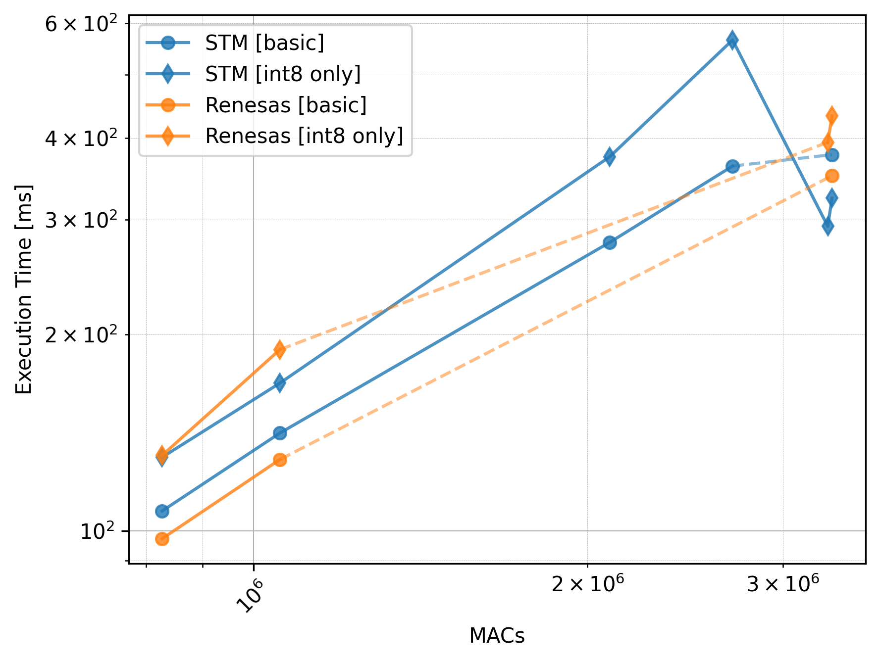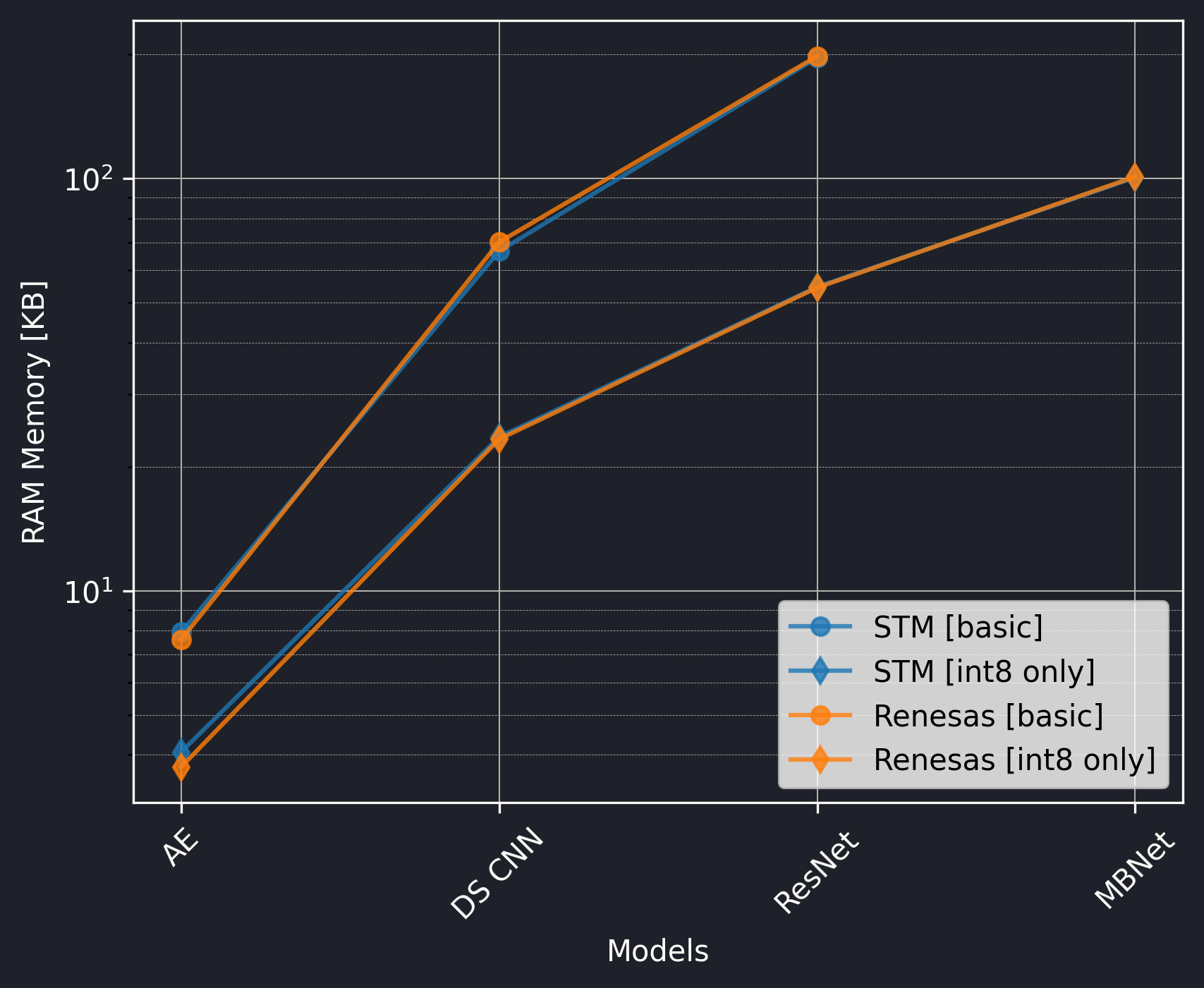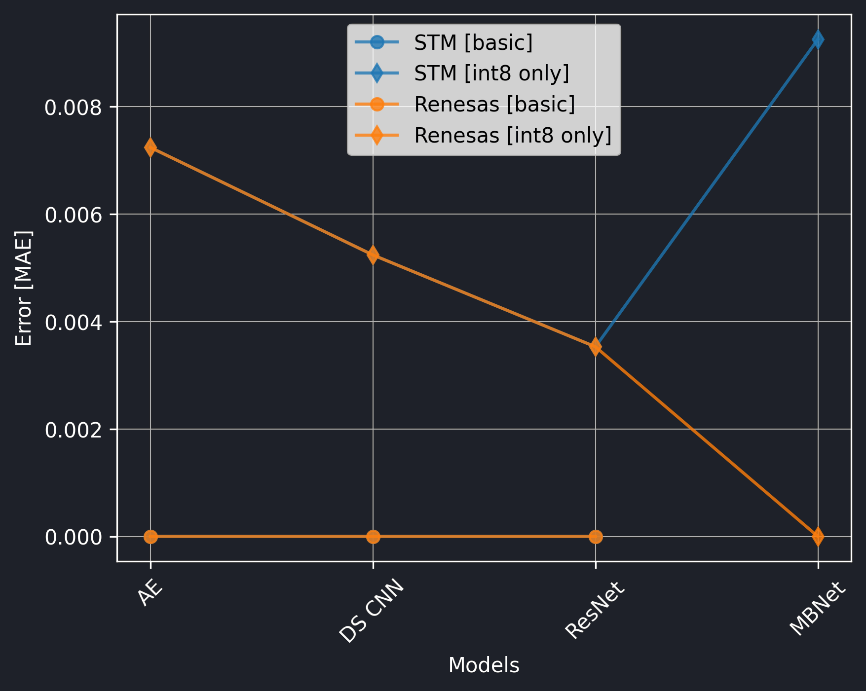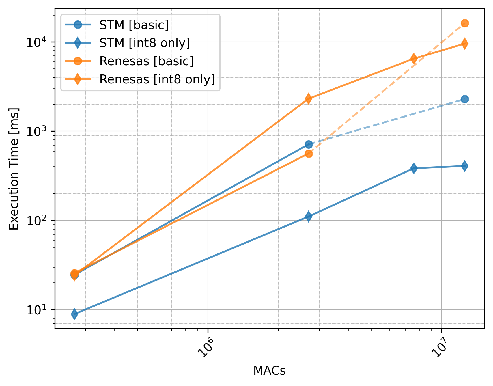 The Renesas board did not utilize the CMSIS-NN library, so we should exclude the int8 only versions from the comparison.