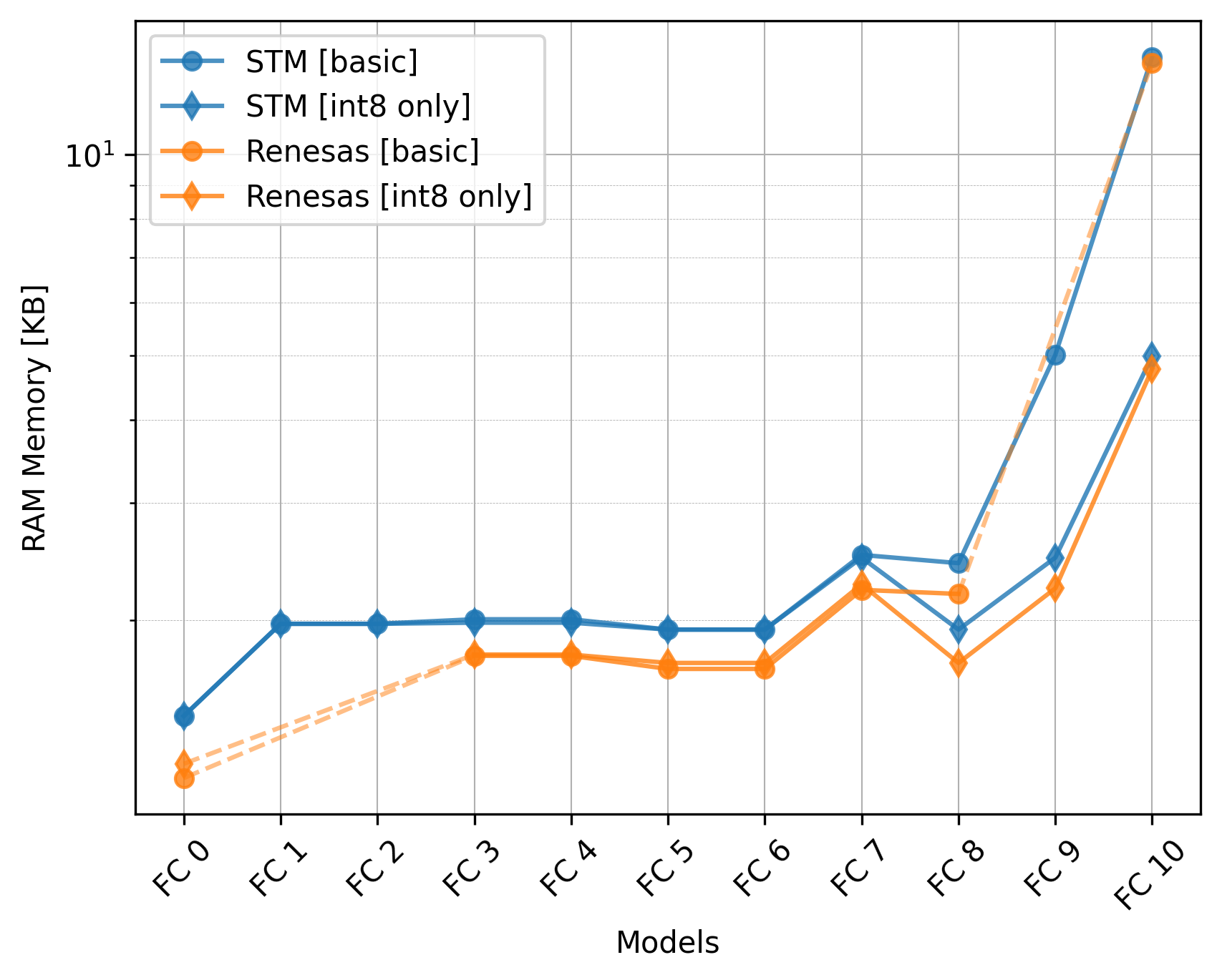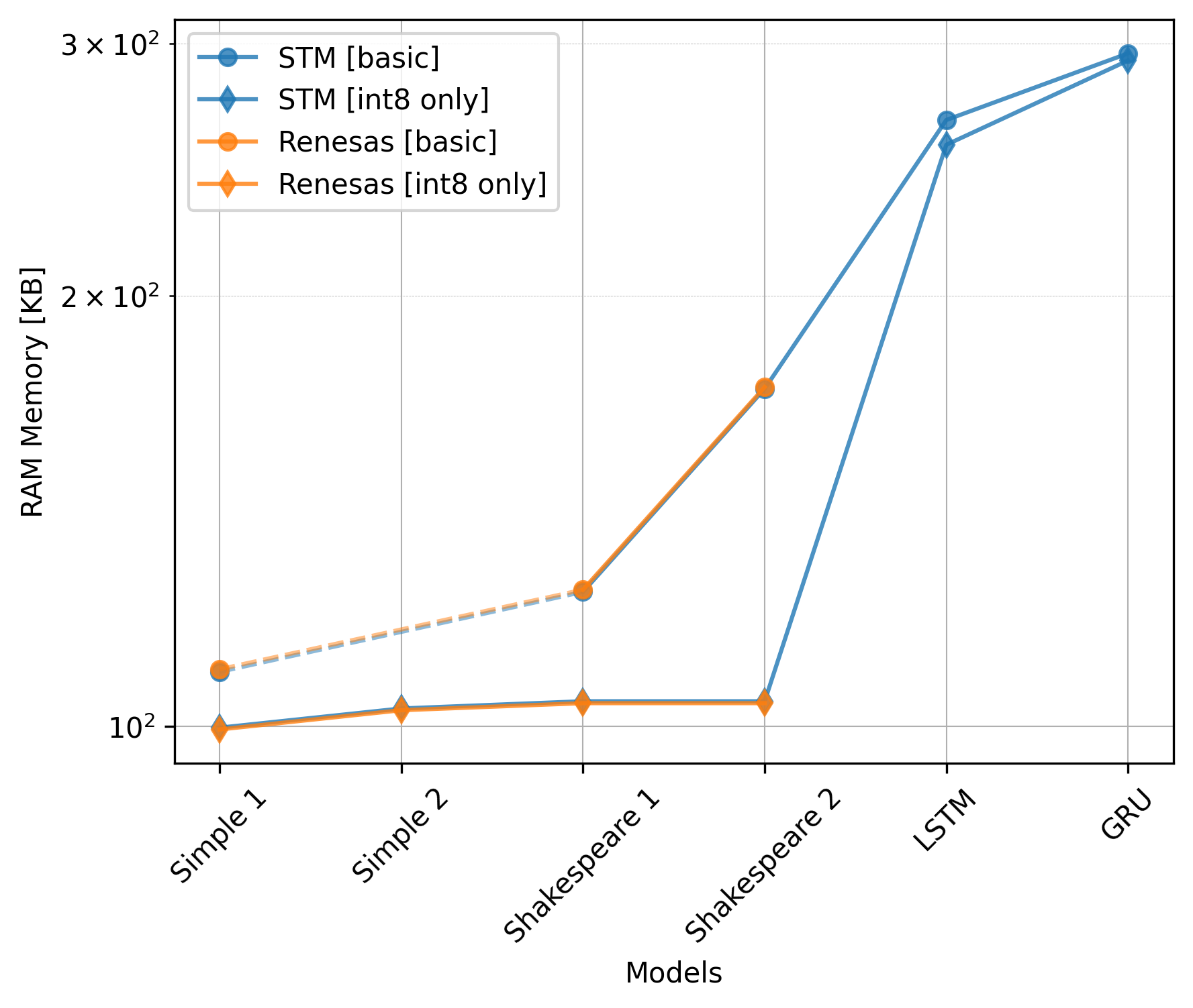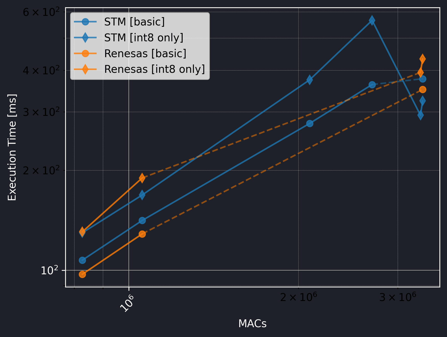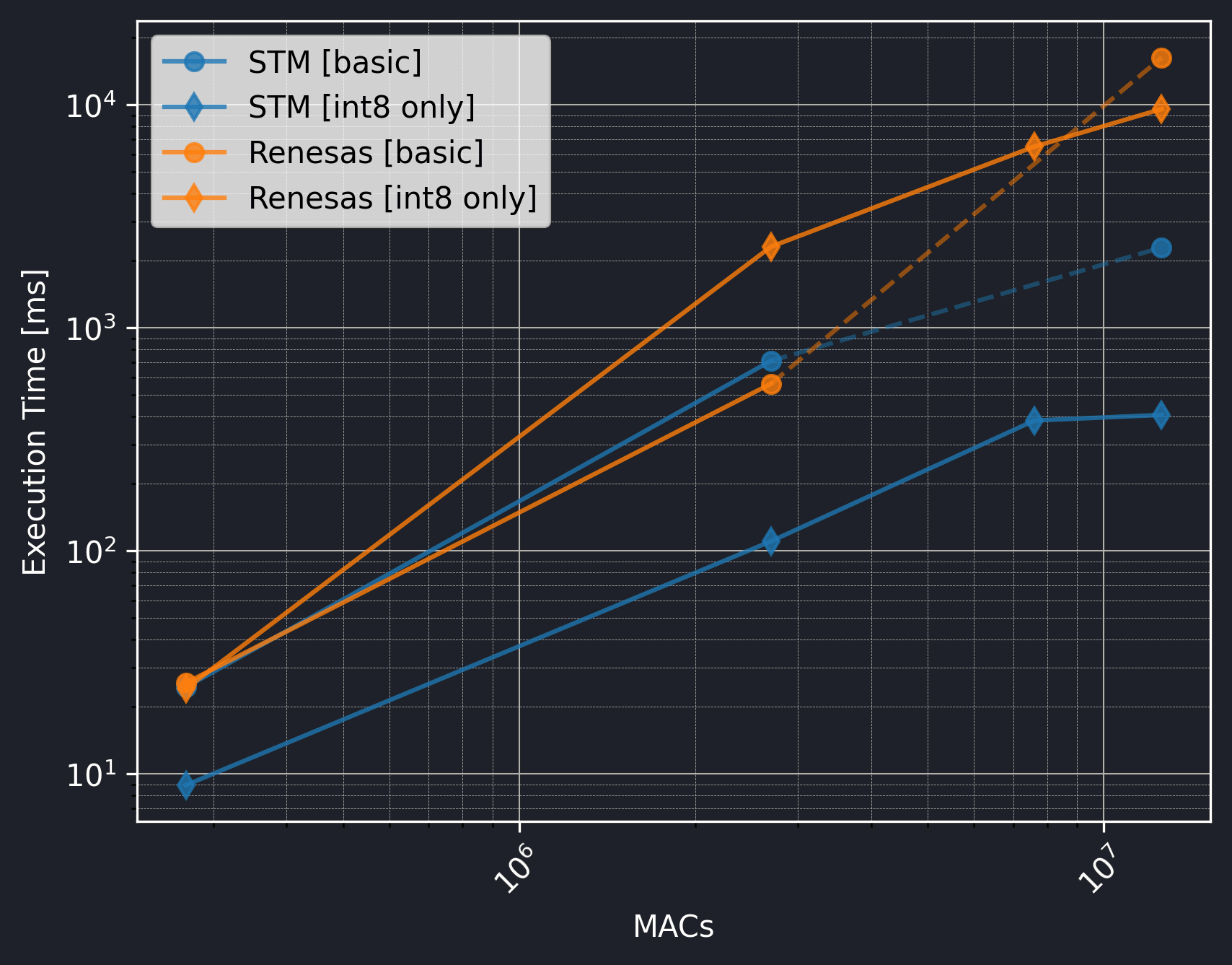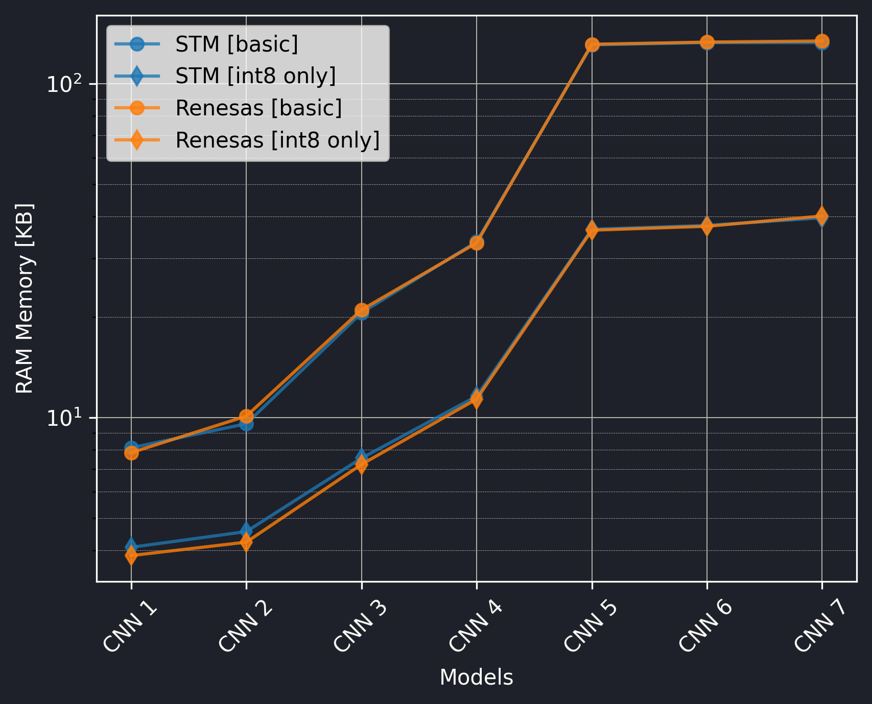 The Renesas board did not utilize the CMSIS-NN library, so we should exclude the int8 only versions from the comparison.