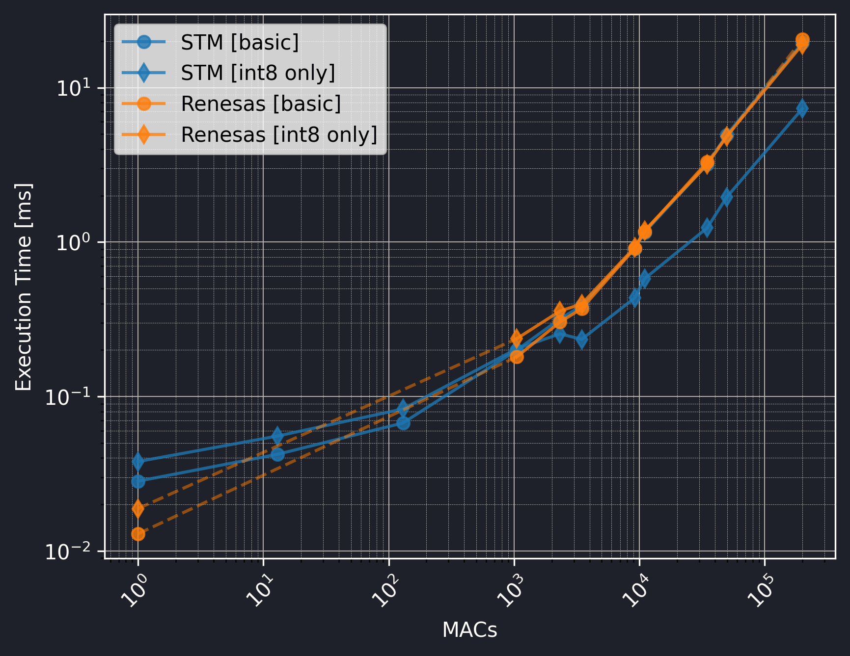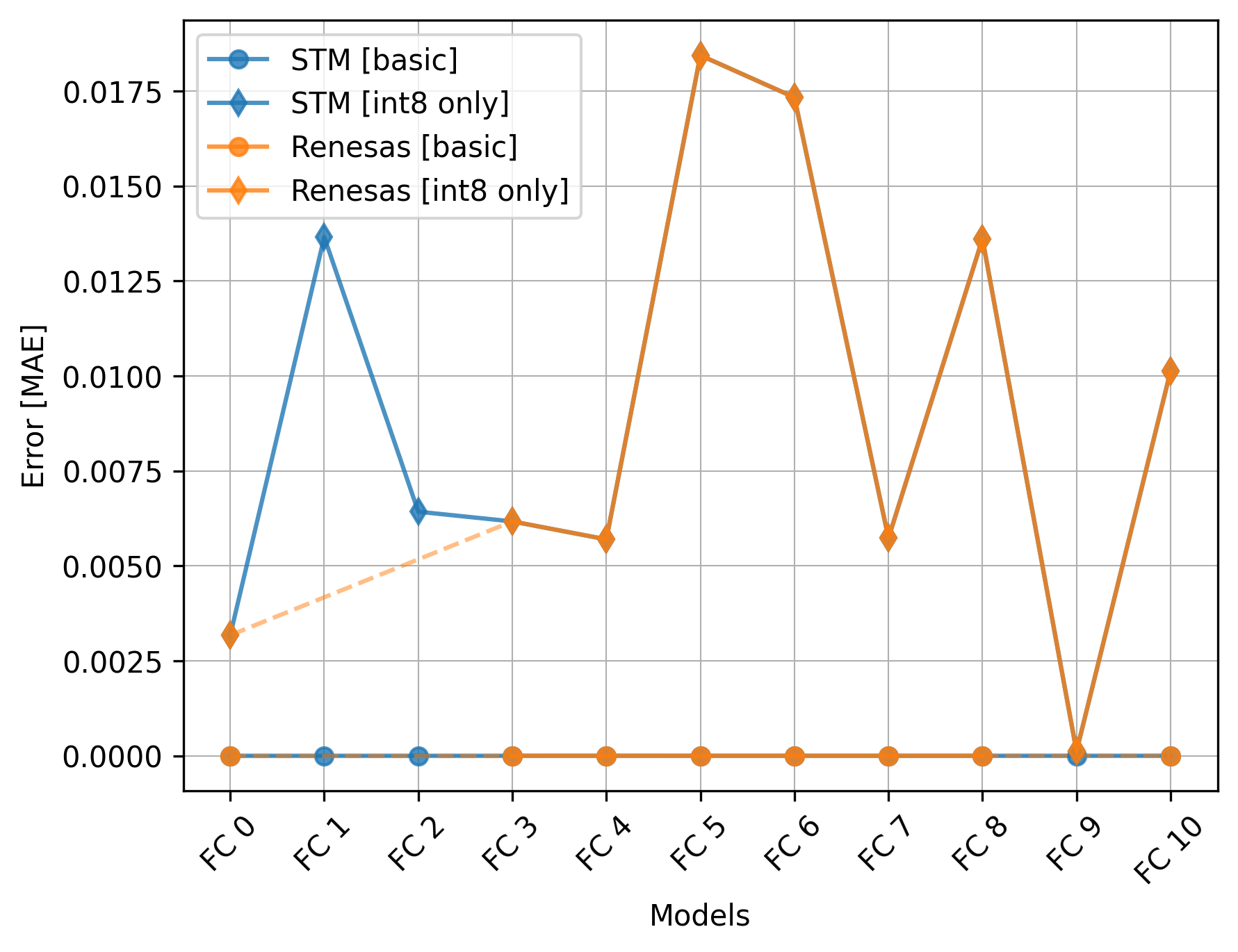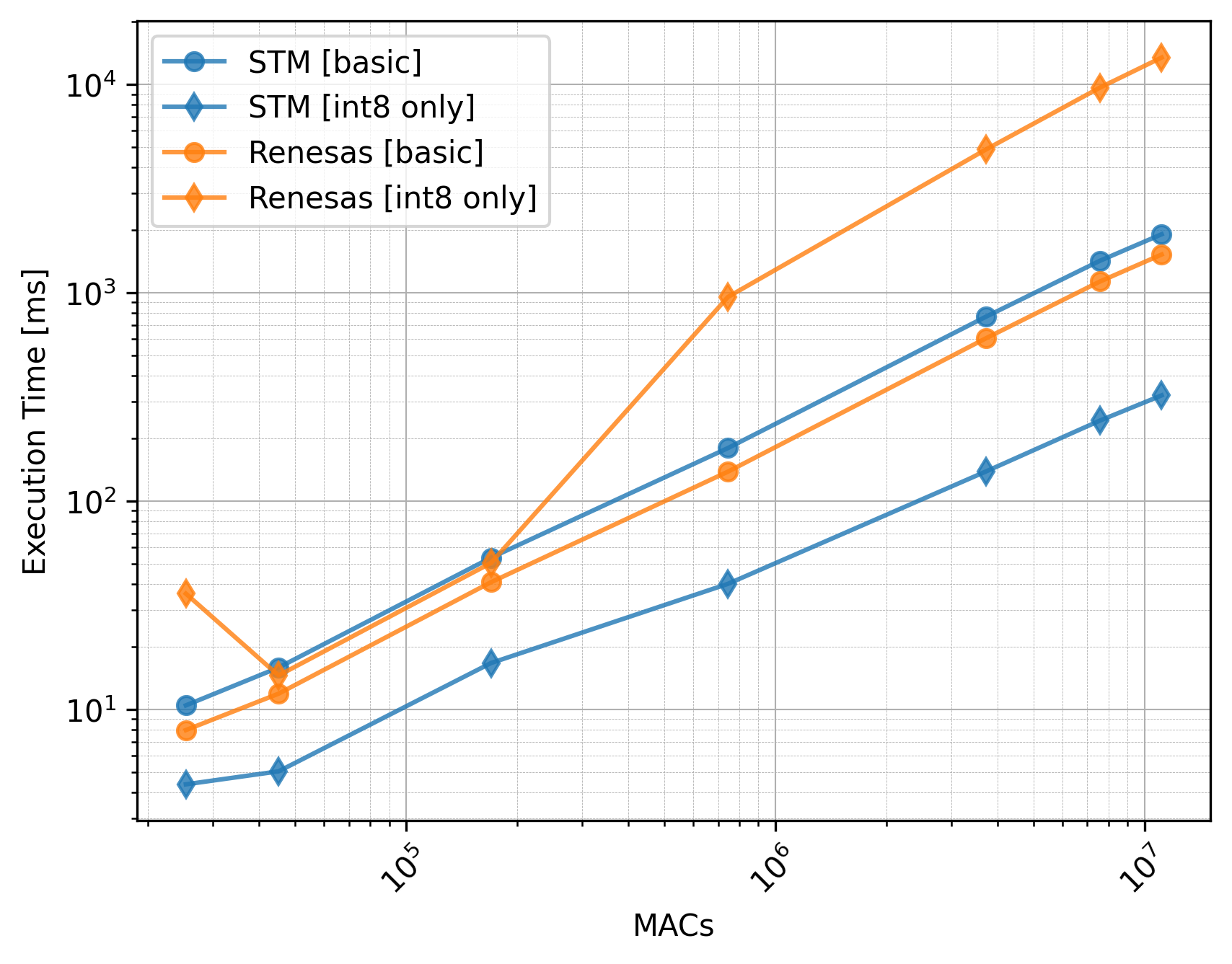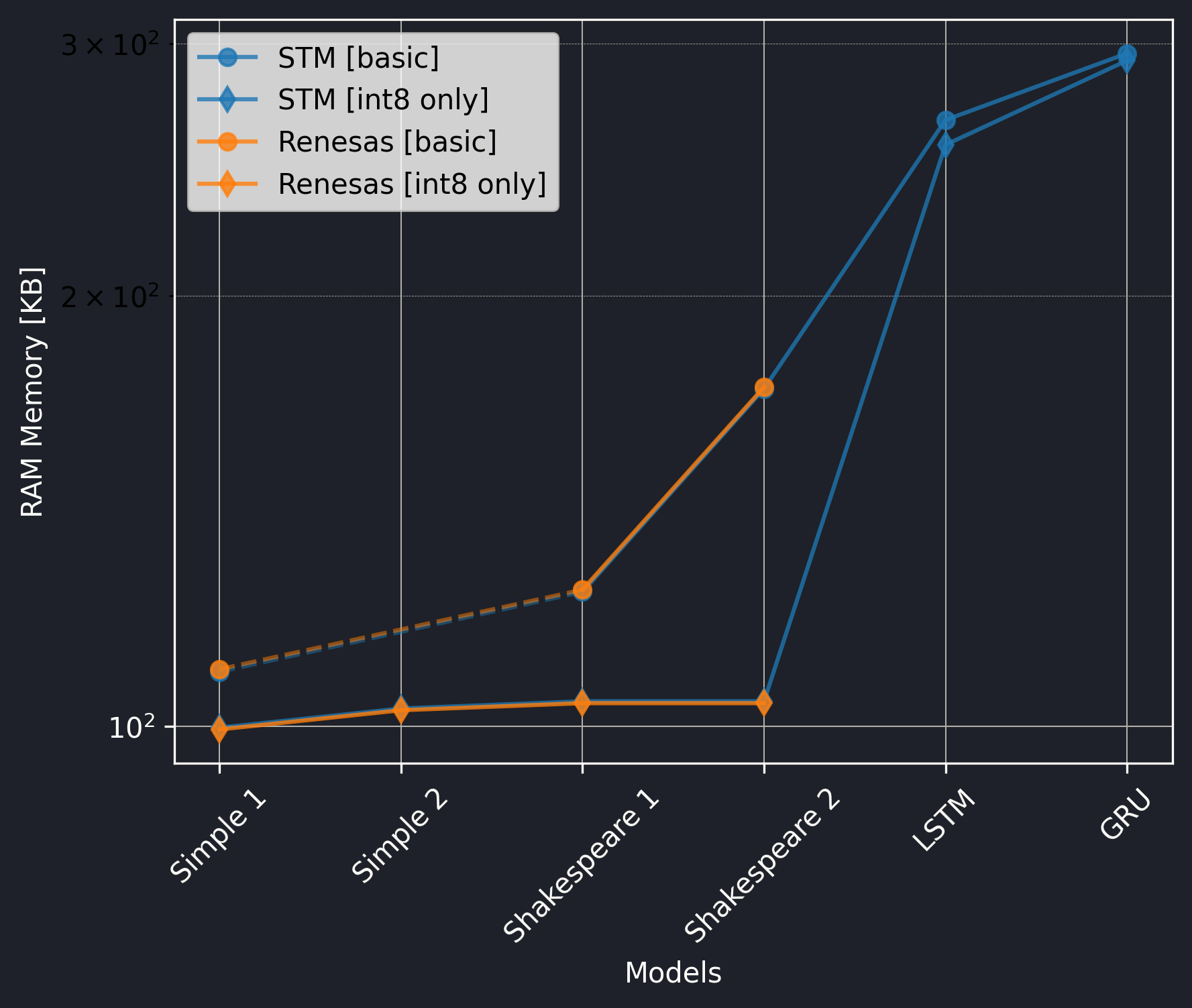 The Renesas board did not utilize the CMSIS-NN library, so we should exclude the int8 only versions from the comparison.