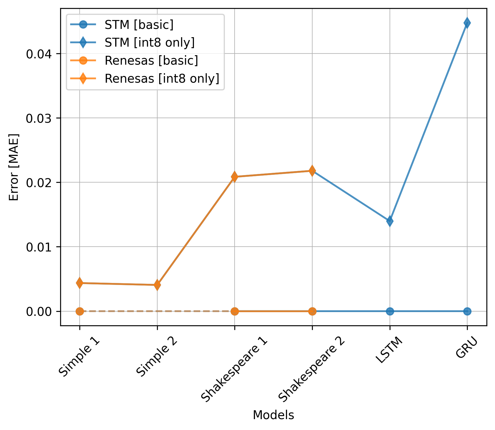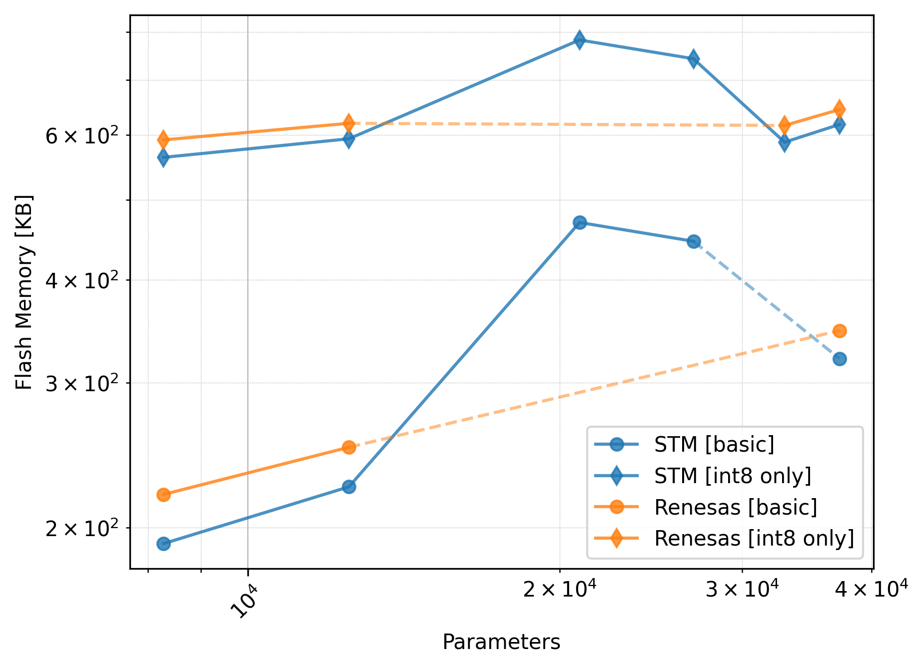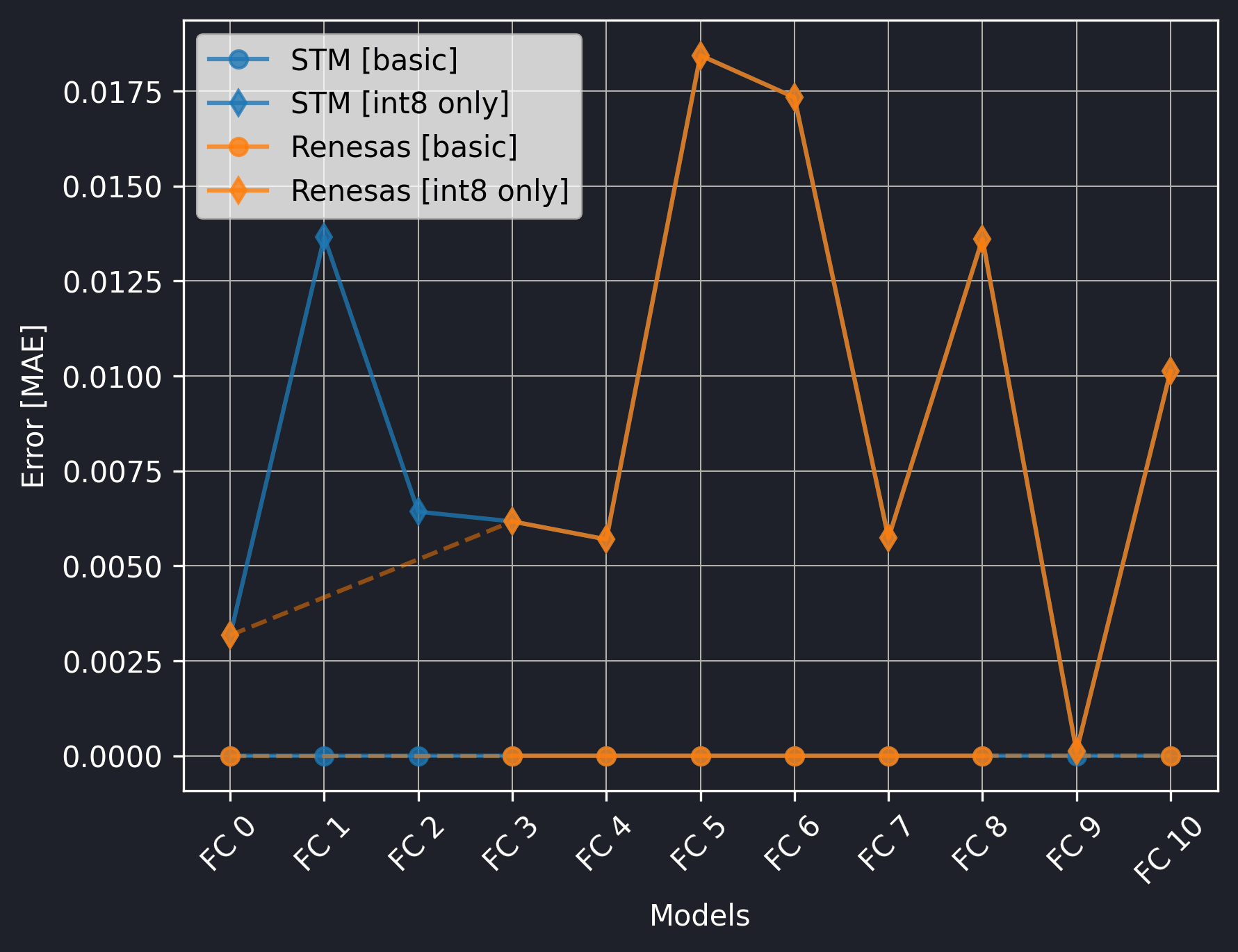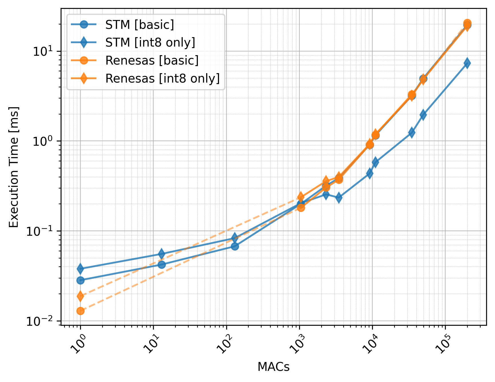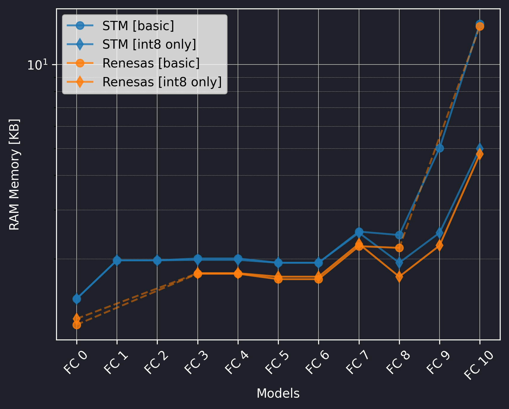 The Renesas board did not utilize the CMSIS-NN library, so we should exclude the int8 only versions from the comparison.