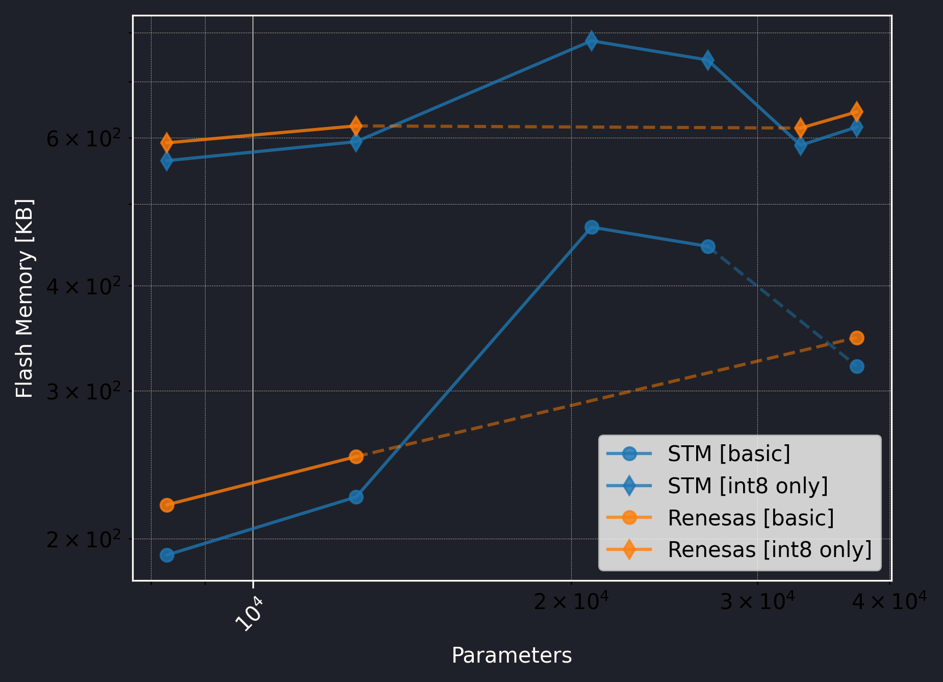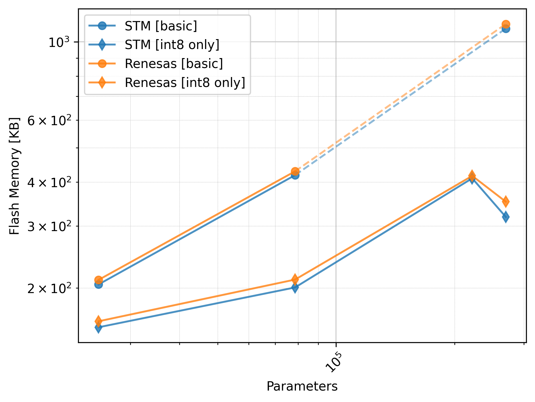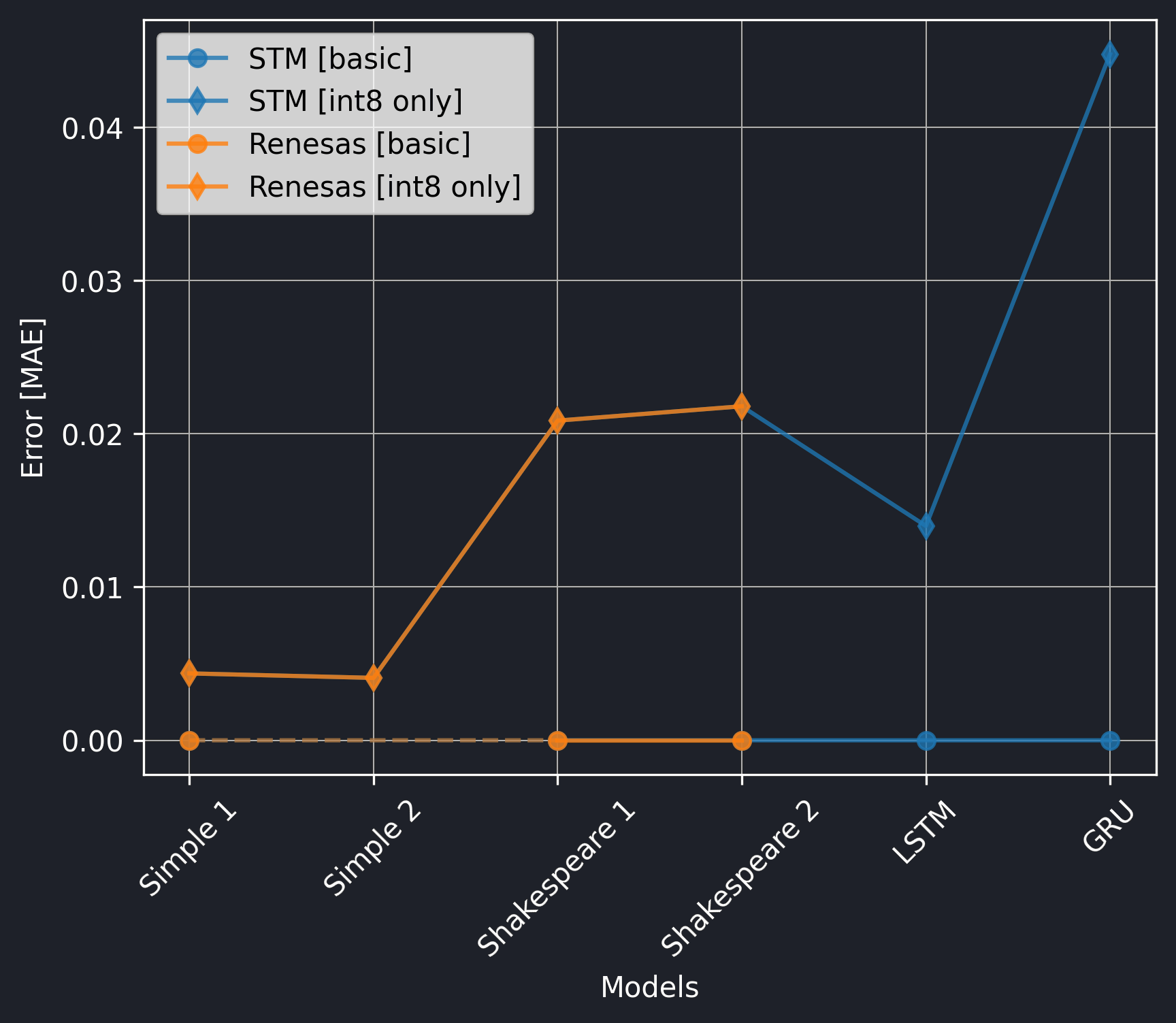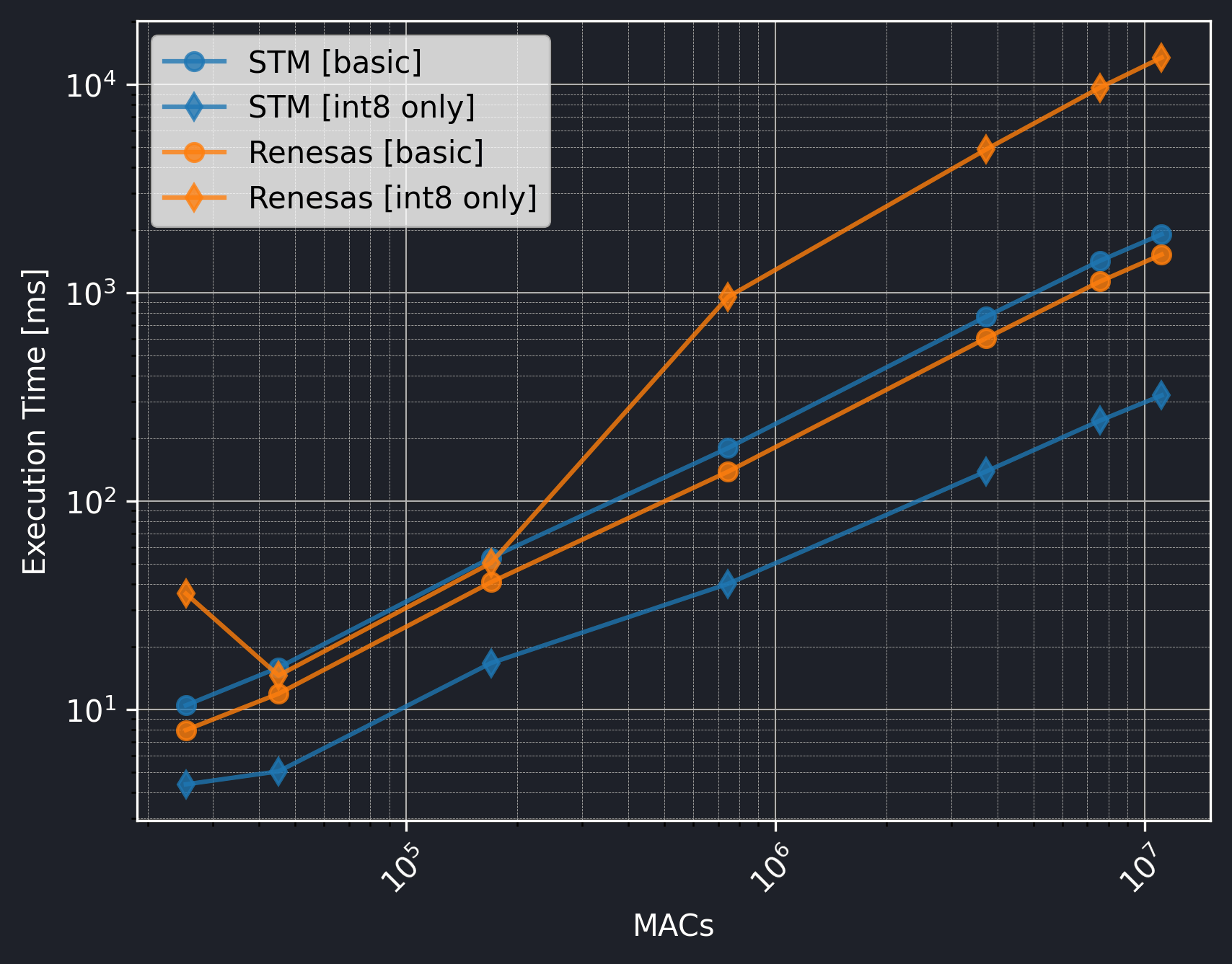 The Renesas board did not utilize the CMSIS-NN library, so we should exclude the int8 only versions from the comparison.